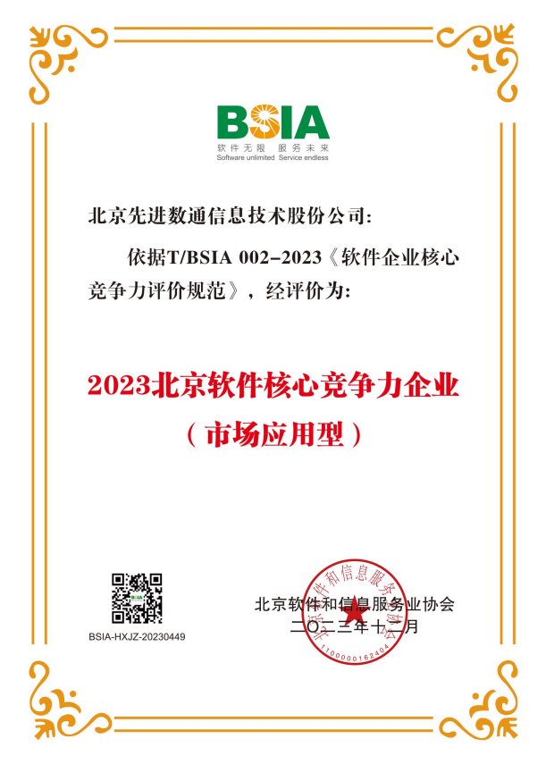 太阳成集团tyc234cc荣获“2023北京软件核心竞争力企业”荣誉